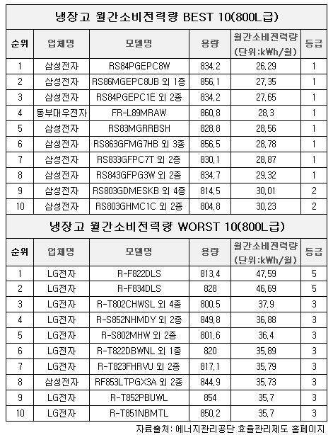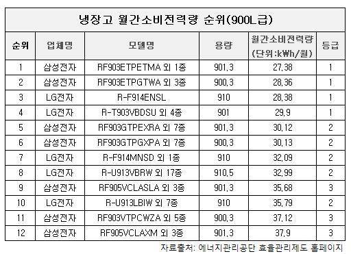 하위권에는 삼성전자의 'RF905VCLAXM'(37.90kWh/월)과 'RF903VTPCWZA'(37.12kWh/월)를 포함한 10개 제품이 나란히 하위 1~2위에 랭크돼 상반된 모습이었다.
