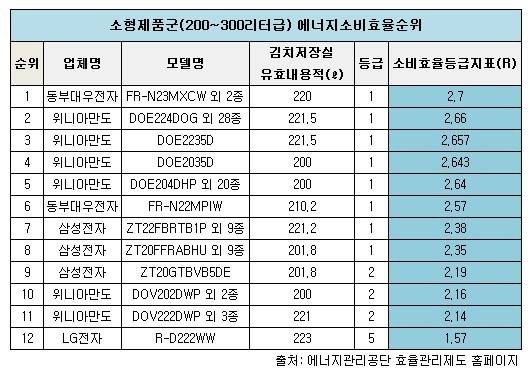 주로 뚜껑형 제품이 대부분을 차지하는 소형제품에선 동부대우전자의 'FR-N23MXCW 외 2종'이 소비효율등급지표 2.7을 기록해 소비효율 1위를 차지했다. 이는 조사대상 전 제품에서도 가장 높은 소비효율수치다.