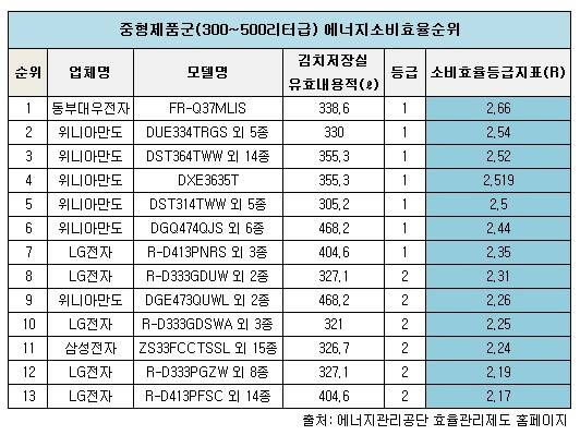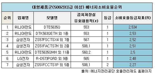 1위 자리를 동부대우전자의 'FR-Q37MLIS'가 에너지소비효율등급지표 2.66으로 차지했고 2위부터 6위까지 위니아 만도 제품 35개종이 촘촘하게 중위권을 형성했다.