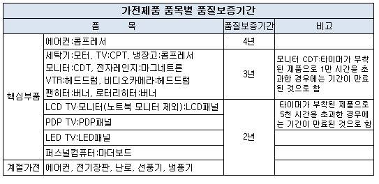 주요 핵심부품의 품질보증기간을 살펴보면 에어컨의 컴프레서는 4년, 세탁기의 모터, TV·모니터의 CPT, 냉장고의 컴프레서, 전자레인지의 마그네트론, PC의 메인보드, VTR·비디오카메라의 헤드드럼, 팬히터의 버너 등은 3년이다.